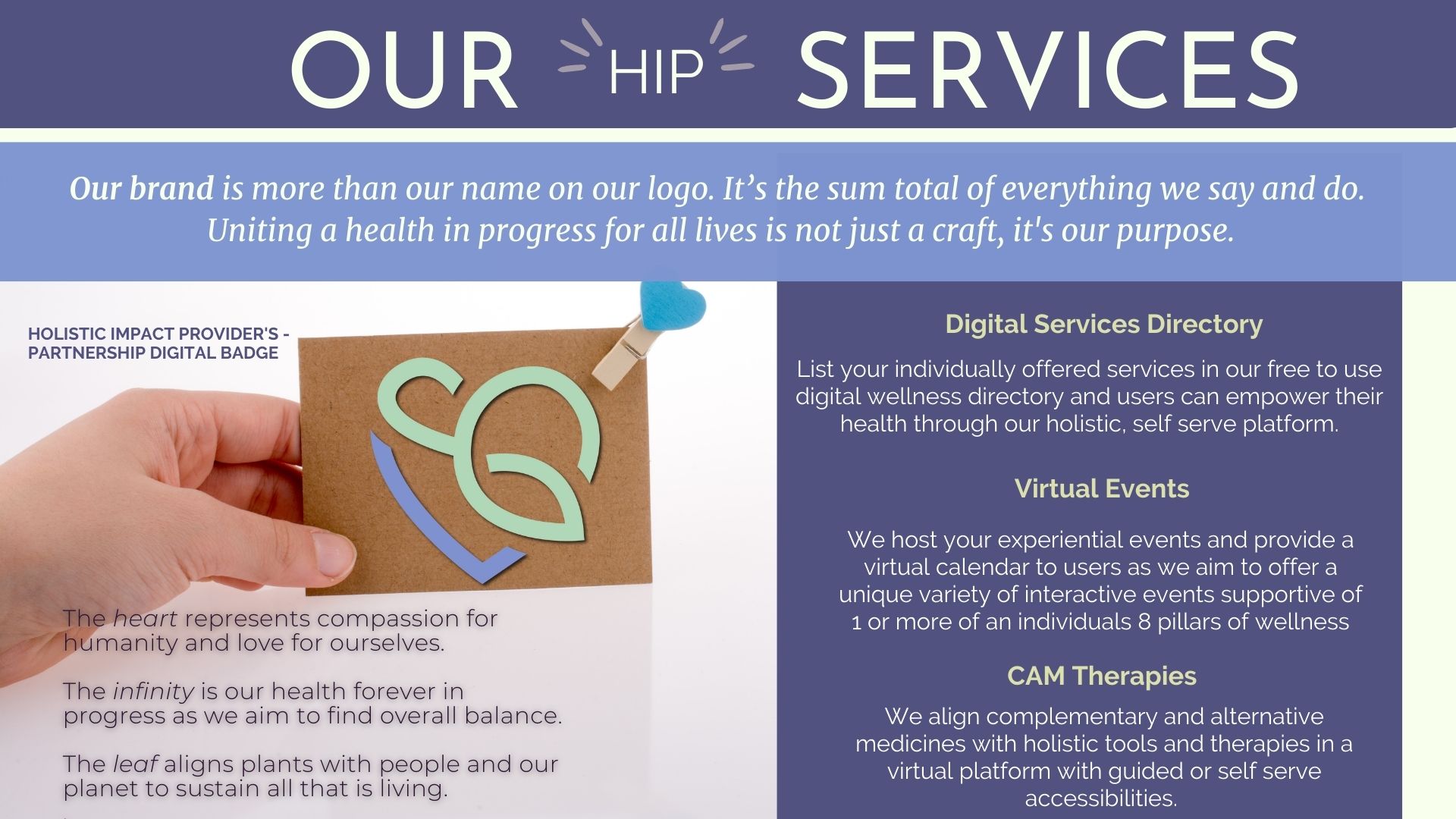 Hip United is a digital network made up of holistic health-supportive resources that, through a self-serve, a la carte menu, members can access wellness options and tools that are intended for all lives. Our health-in-progress mission means that we recognize the barriers faced in healthcare globally and acknowledge that striving towards wholeness is the number one way to combat problems at the surface level before they accumulate into larger issues.