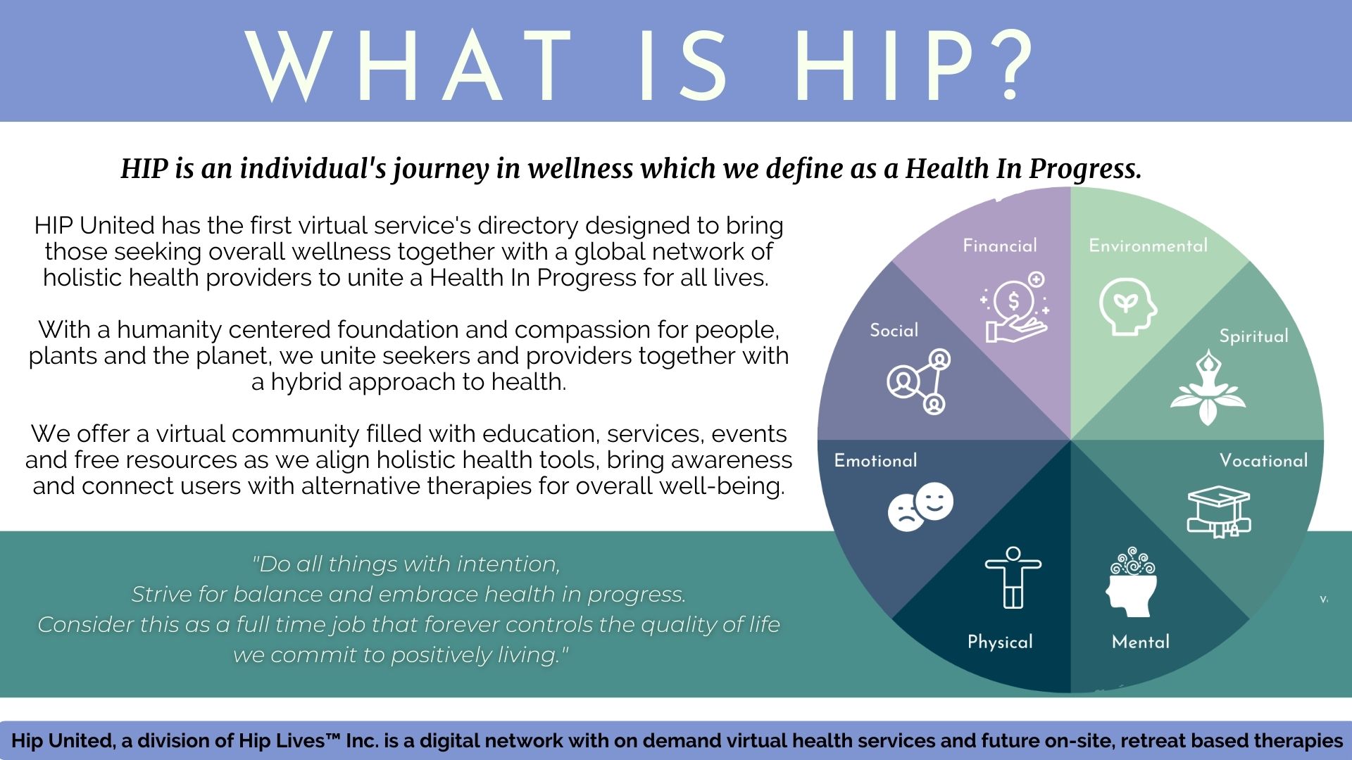 Hip United is the 1st VIRTUAL WELLNESS HOLISTIC DIRECTORY featuring its turnkey digital rolodex of tools and services, providing users with vetted, professional resources in support of a Health in Progress for all lives! HIP also invites the educators and experts to host their services, products and educational tools to amplify their businesses and support the well-being of those seeking solutions around the world.