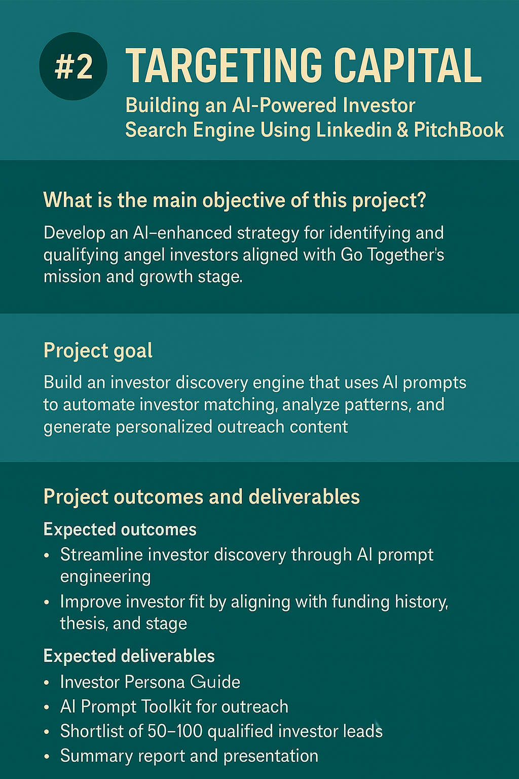 Learners are expected to build and test an investor discovery engine that uses AI prompts to automate investor profile matching, analyze behavioral patterns, and generate personalized outreach content. This tool will increase Go Together’s capital-raising efficiency during its current funding round.